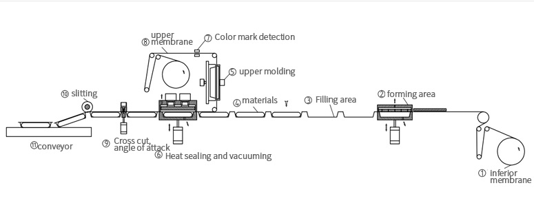 The whole machine is operated by PLC control panel to set specific parameters and stop running. Upper film holder: Take a roll of upper film and install it on the upper film holder, and put the upper film into the sealing area through the sliding rod.
